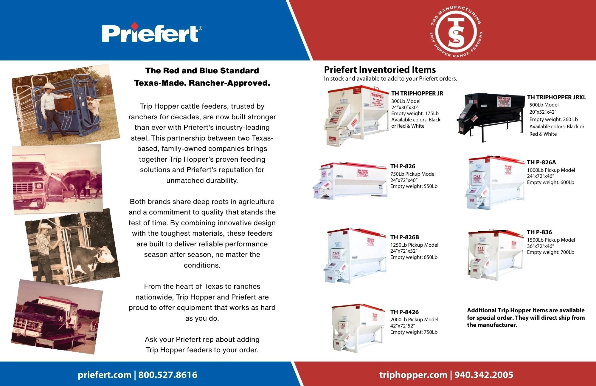 Trip Hopper and Priefert, two family-owned Texas companies with deep roots in agriculture, are proud to announce a new partnership. Priefert will serve as a distributor for Trip Hopper’s cattle feeders, making them available to Priefert’s extensive network of dealers. As part of this collaboration, Trip Hopper’s feeders will now be reinforced with Priefert’s industry-leading steel, bringing unmatched durability to ranchers nationwide.